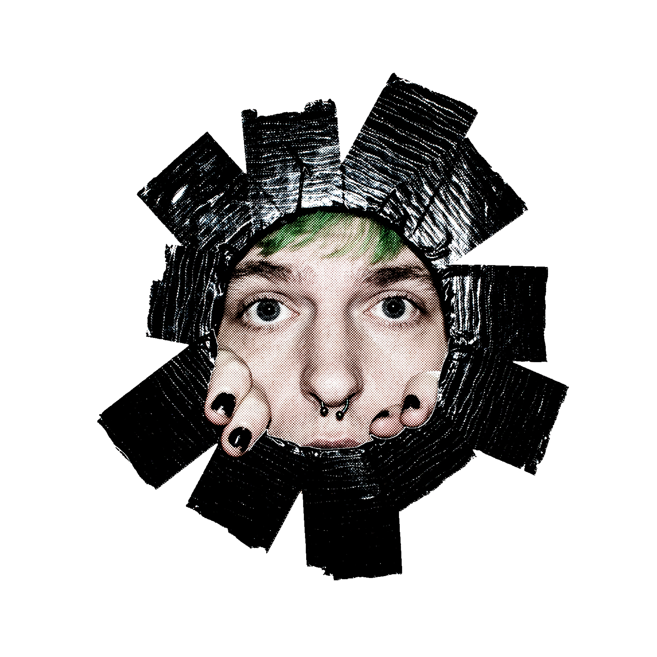 Duct tape, Glitter tape, Oil pastel, Alcohol pen, Ball point pen on paper.